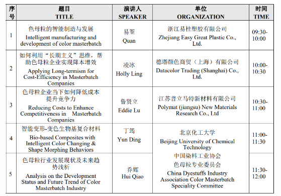 第23届中国国际染料工业及有机颜料、纺织化学品展览会将于2024年4月17日-19日在上海世博展览馆举行。中国染料工业协会色母粒专业委员会为了让前来参观或参展的会员收获更多,将于4月18日上午为会员单位组织专场报告会。一、色母粒专场报告会精选以下报告