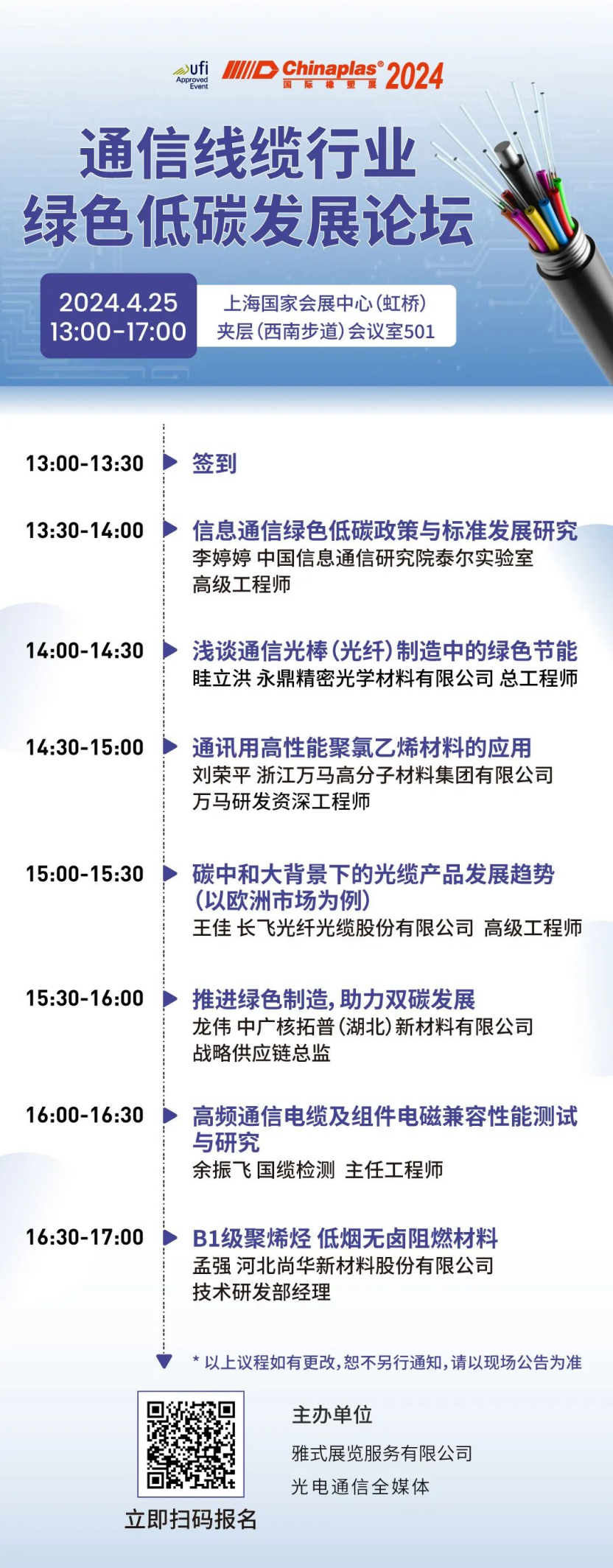 展会同期,为推动通信线缆产品附加值的提升,以促进通信线缆行业的健康发展,光电通信全媒体联合CHINAPLAS 2024 国际橡塑展,在4月25日13:00-17:00共同主办《通信线缆行业绿色低碳发展论坛》。会议将着重探讨绿色制造和循环利用技术,并深入研讨这些技术在通信线缆行业的广泛应用以及为行业带来的广阔市场前景。