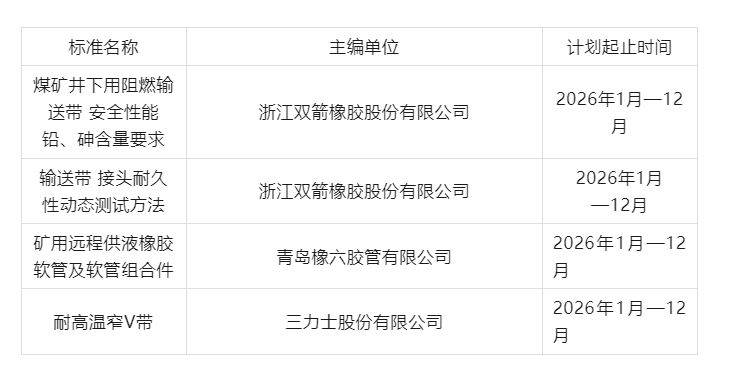 据橡胶助剂产业网了解,在同期举行的立项论证会议中,另有四项新的胶管胶带团体标准提案通过了论证,获准列入协会2026年上半年的标准制定计划。新立项的标准包括《煤矿井下用阻燃输送带 安全性能 铅、砷含量要求》等。根据协会标准管理办法,相关分会秘书处将于近期在行业内公开征集上述标准的联合起草单位,组建编制工作组,并有序推进后续的制定工作。