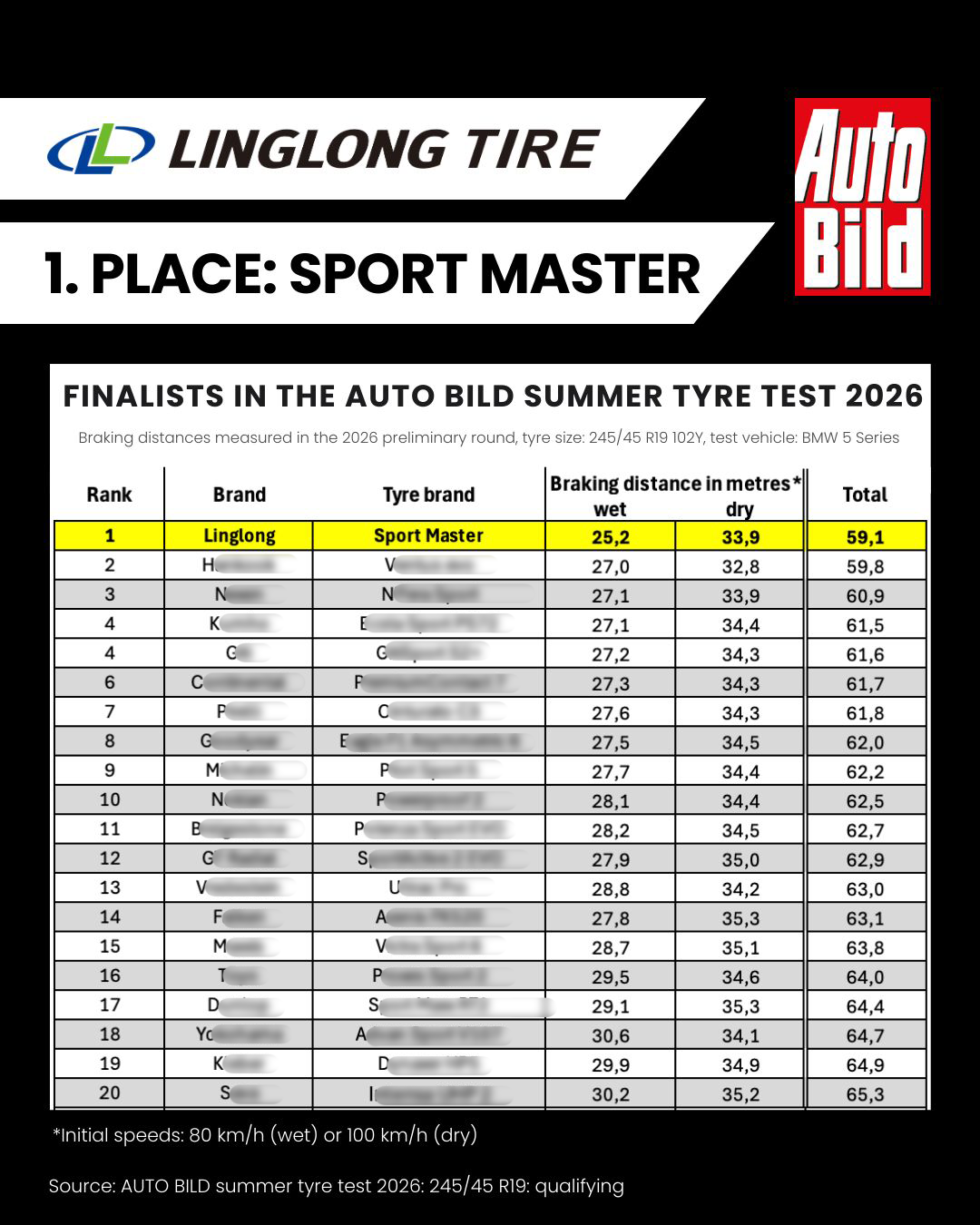 【橡胶助剂产业网】2月26日消息,中国轮胎品牌玲珑轮胎旗下产品Sport Master近日在欧洲权威汽车媒体《Auto Bild》举办的2026年大型夏季轮胎测试预选中,凭借卓越性能在50款参测产品中脱颖而出,以干湿地制动总成绩第一的优异表现成功晋级决赛,并引发行业广泛关注。