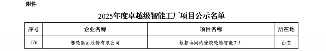 【橡胶助剂产业网】9月17日消息,赛轮集团近日凭借"数智协同的橡胶轮胎智能工厂"项目成功入选工业和信息化部2025年度卓越级智能工厂公示名单,这标志着该企业在智能制造领域的实践成果获得国家层面认可。