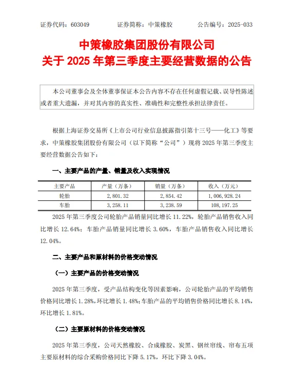 【橡胶助剂产业网】10月21日消息,10月20日晚,中策橡胶集团股份有限公司(603049)发布了2025年第三季度主要经营数据公告,多项指标表现亮眼,展现出企业在市场拓展、产销平衡、产品优化及成本控制等方面的卓越成效。