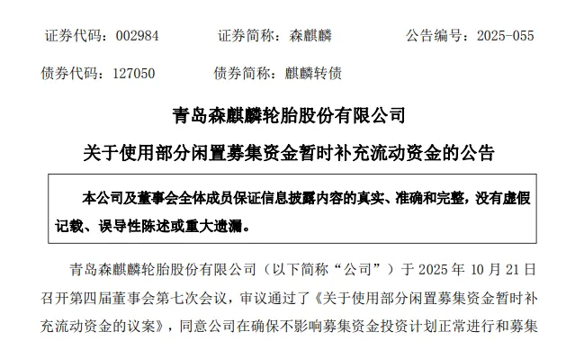 【橡胶助剂产业网】10月25日消息,森麒麟轮胎近日宣布将动用10亿元闲置募集资金补充企业流动资金。根据公司第四届董事会第七次会议决议,在确保募投项目正常推进和资金安全的前提下,这笔资金将用于满足业务扩张需求,使用期限不超过12个月。