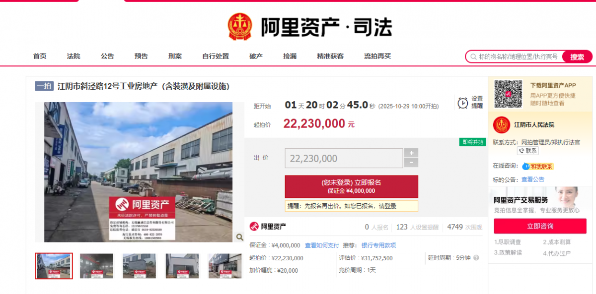 【橡胶助剂产业网】10月27日消息,江阴市安利达轮胎有限公司名下位于斜泾路12号的工业房地产及附属设施即将启动司法拍卖程序。根据江阴市人民法院公告,该资产将于2025年10月29日10时至次日10时在司法拍卖平台进行首次公开拍卖,起拍价格定为2223万元。