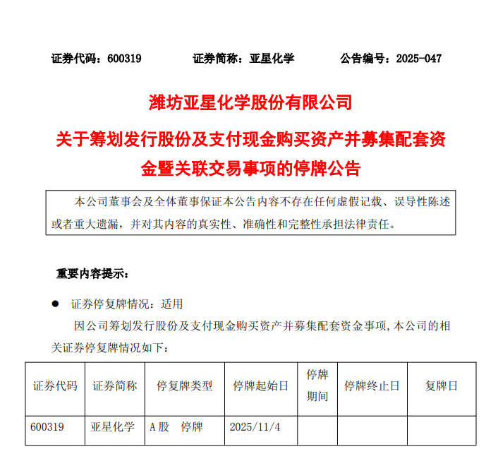 【橡胶助剂产业网】11月4日消息,潍坊亚星化学股份有限公司近日发布公告,宣布正在筹划以发行股份及支付现金相结合的方式收购山东天一化学股份有限公司控股权。这一重大资产重组事项导致公司股票自11月4日起停牌,预计停牌时间不超过10个交易日。