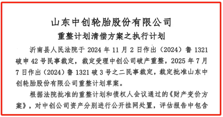 【橡胶助剂产业网】11月6日消息,山东中创轮胎股份有限公司管理人11月4日正式发布重整计划清偿方案实施细则,标志着这家曾规划总投资50亿元的大型轮胎企业正式进入债务清偿执行阶段。此举意味着中创轮胎在经历长期经营困境后,其司法重整工作取得实质性进展。