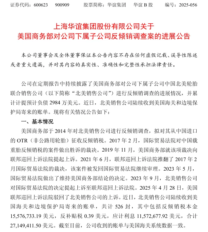 【橡胶助剂产业网】11月14日消息,华谊集团今日发布公告,披露其美国反倾销调查案件取得新进展。公司下属子公司中国北美轮胎联合销售公司近日收到美国海关与边境保护局发出的526份税款账单,账单总金额达2715万美元。
