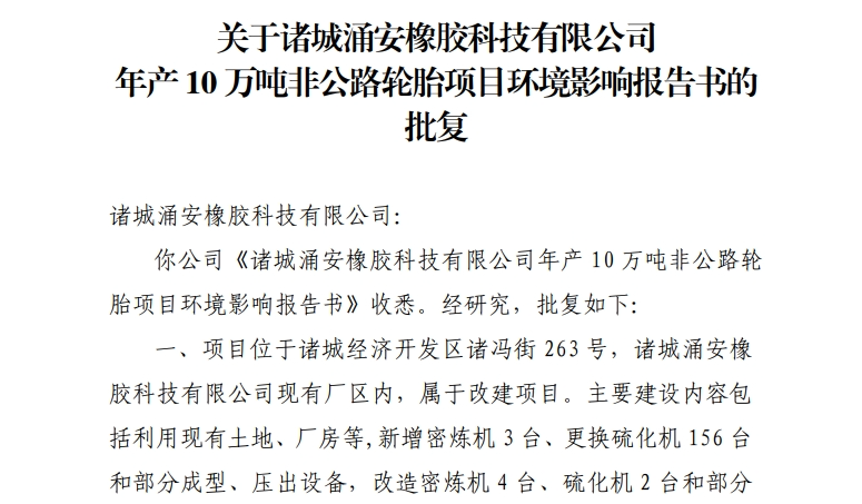 据橡胶助剂产业网了解,涌安橡胶目前正在推进"年产10万吨非公路轮胎项目"建设。该项目的环境影响报告书已于2024年9月30日获得批复,其中一期工程在2025年6月顺利通过竣工环境保护验收。