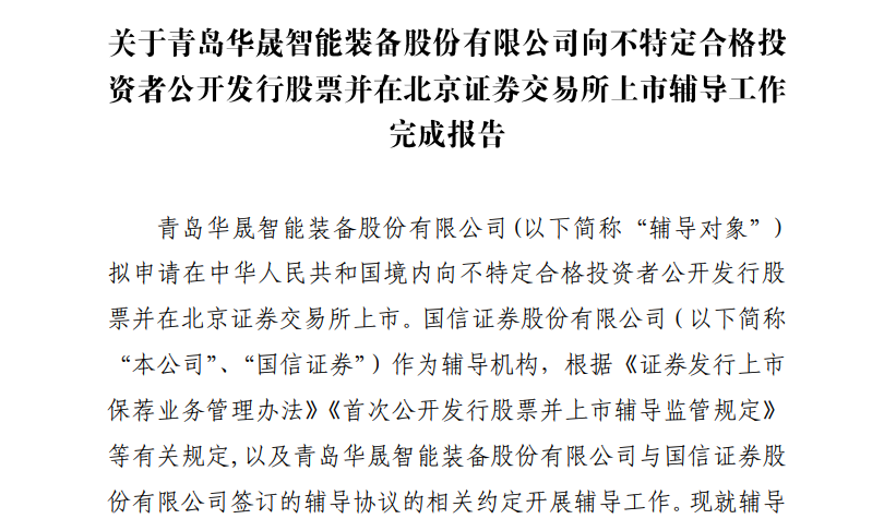 【橡胶助剂产业网】11月20日消息,青岛华晟智能装备股份有限公司已于11月17日向青岛证监局提交辅导工作完成报告,标志着该公司向资本市场迈出了关键一步。华晟智能在今年1月20日于新三板正式挂牌,仅四个月后的5月20日便成功进入创新层,展现了良好的发展态势。