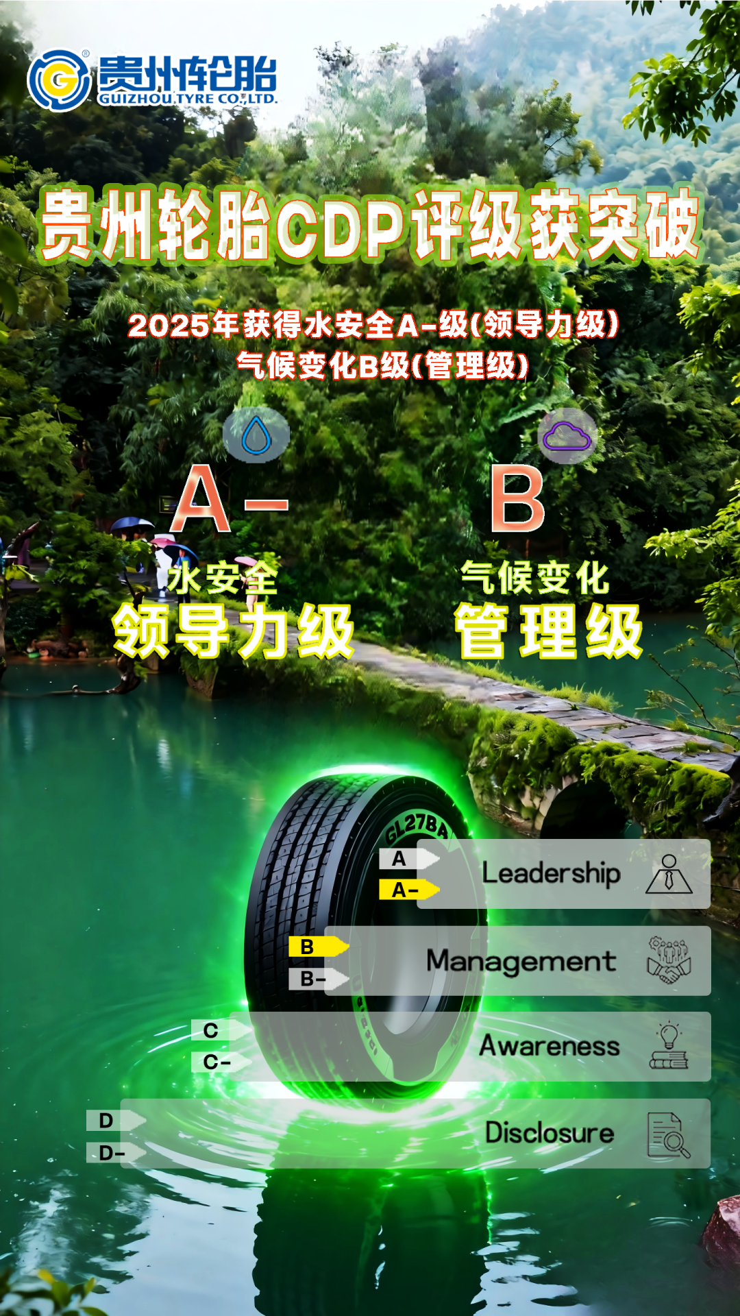 【橡胶助剂产业网】12月11日消息,全球权威环境数据披露平台CDP近期发布了2025年度评分结果。其中,贵州轮胎股份有限公司在“水安全”与“气候变化”两个关键环境议题的评估中,取得了突破性表现。