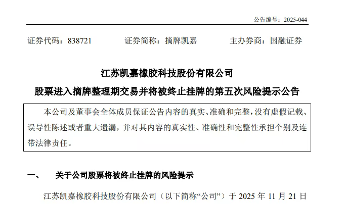 【橡胶助剂产业网】12月15日消息,江苏凯嘉橡胶科技股份有限公司将自全国中小企业股份转让系统退市。根据全国股转公司决定,该公司股票将于2025年12月22日起终止挂牌,直接原因是其未能按时披露2024年年度财务报告。