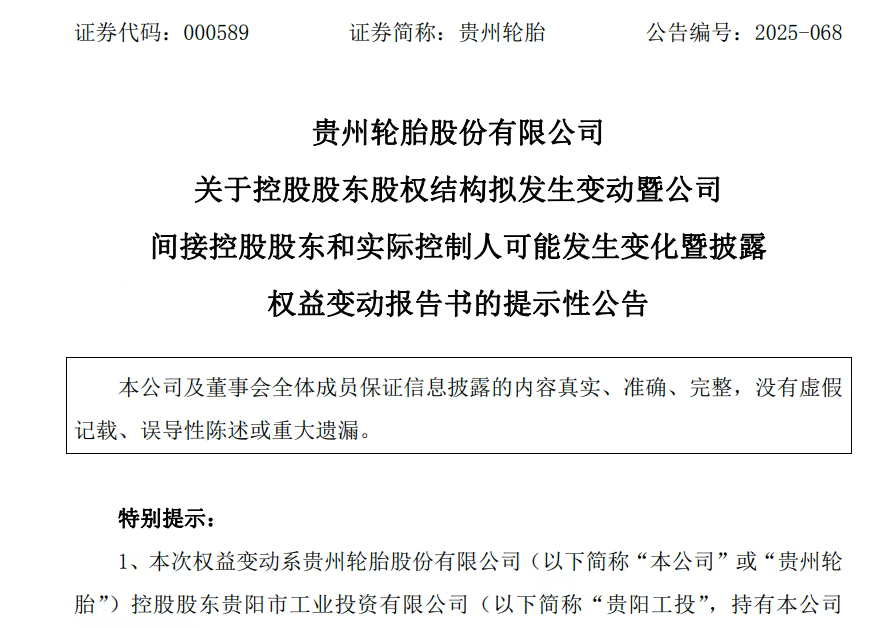 【橡胶助剂产业网】12月17日消息,贵州轮胎股份有限公司发布公告,其控股股东层面的重大股权变更迎来实质性步骤。本次交易完成后,上市公司的最终实际控制方将由贵阳市国有资产监督管理委员会调整为贵州省国有资产监督管理委员会,意味着公司控制权层级获得提升。