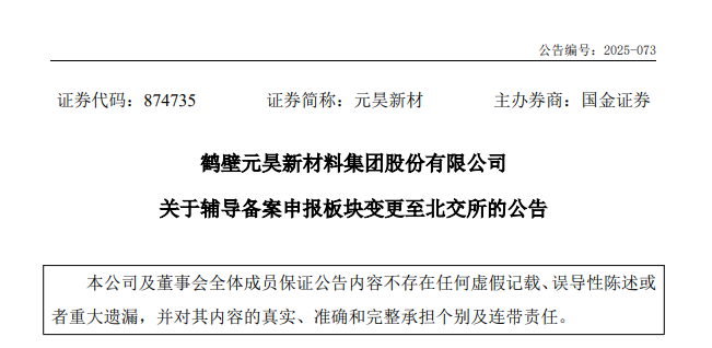 【橡胶助剂产业网】12月23日消息,鹤壁元昊新材料集团12月19日发布公告,称根据自身发展情况及资本市场环境变化,为更好推动公司成长,拟将首次公开发行股票并上市的辅导备案板块,由深圳证券交易所创业板变更为北京证券交易所。