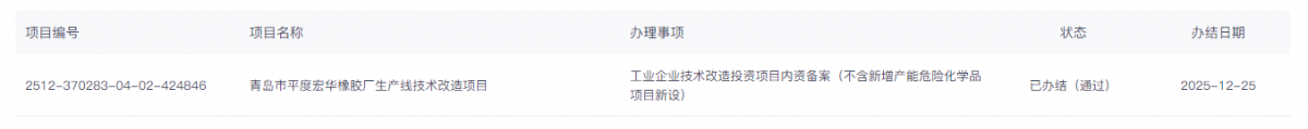 【橡胶助剂产业网】12月29日消息,青岛平度宏华橡胶厂一项旨在提升生产线智能化水平的技术改造项目,已于近日完成相关备案程序,即将进入实施阶段。该项目计划总投资6001万元人民币,通过对现有租赁厂房内的生产设施进行系统性升级,以提升非公路轮胎制造的效率与工艺水平。
