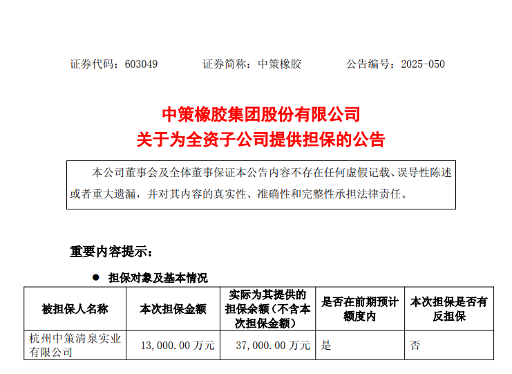 【橡胶助剂产业网】12月31日消息,中策橡胶集团股份有限公司12月29日发布公告,宣布为其全资子公司提供总额1.3亿元人民币的融资担保,以支持子公司经营周转。此次担保合作涉及两家商业银行,体现了母公司对核心业务单元发展的持续支持。