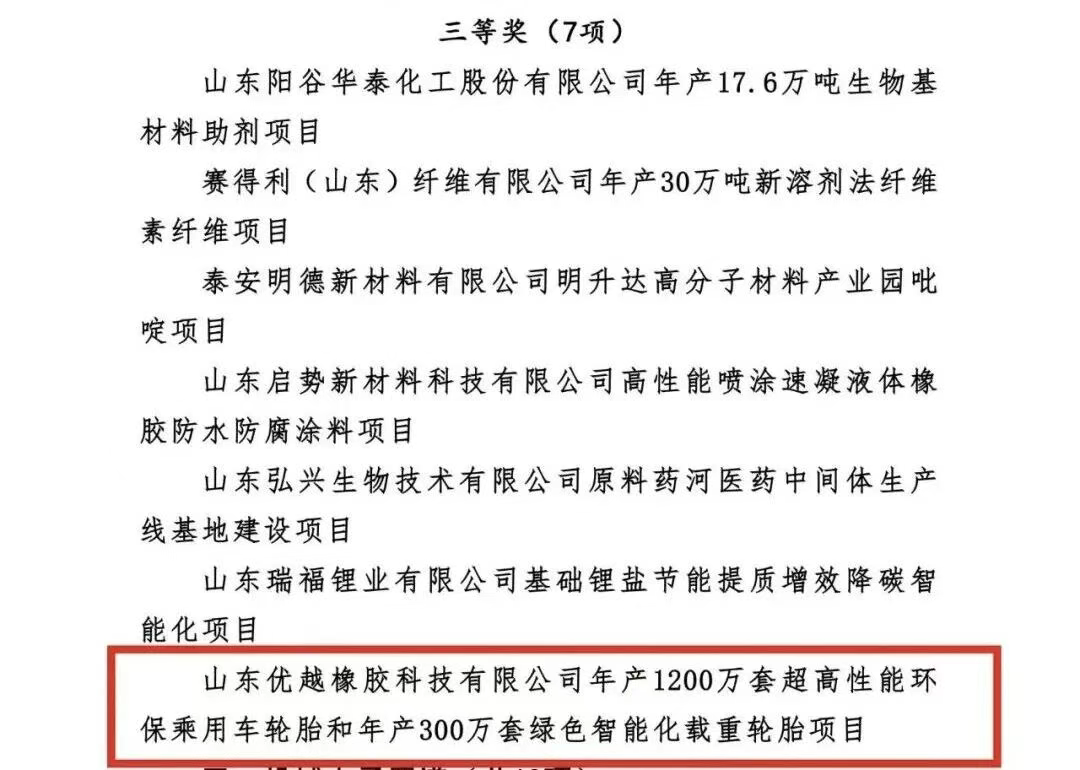 【橡胶助剂产业网】9月8日消息,在近日公布的2025年“鲁兴杯”劳动竞赛决赛获奖名单中,山东优越橡胶科技有限公司凭借其大型轮胎生产项目获得石油化学赛道三等奖。该获奖项目为“年产1200万套超高性能乘用车胎和300万套载重轮胎项目”,展现了企业在产能建设与技术创新方面的综合实力。