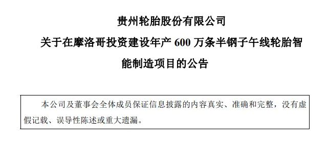1月6日,贵州轮胎股份有限公司发布重要公告,宣布其第九届董事会第六次会议已审议通过在摩洛哥投资建设年产600万条半钢子午线轮胎智能制造项目的议案。这一举措标志着贵州轮胎在国际化道路上迈出了关键一步。