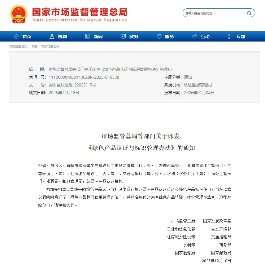 【橡胶助剂产业网】1月7日消息,国家市场监管总局联合其他九个部门,于近日共同修订发布了《绿色产品认证与标识管理办法》。此次修订首次对我国绿色产品认证活动作出了系统性、全面的统一规范,标志着该体系的管理重心,正从过去单一的标识管理向覆盖认证全链条的精细监管转变。