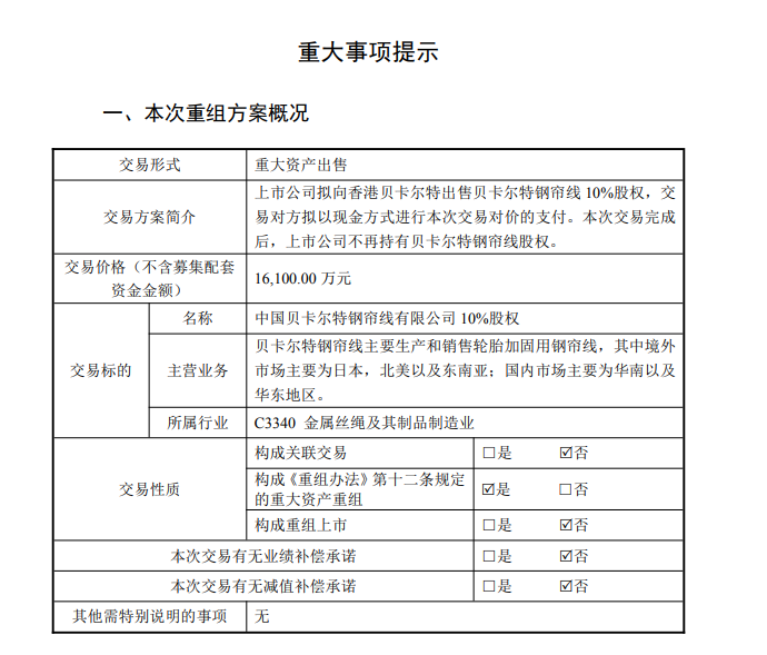 标的公司贝卡尔特钢帘线主营业务为轮胎骨架材料——钢帘线的生产与销售。财务数据显示,该公司在2023年、2024年及2025年前三季度分别实现营业收入约13.03亿元、12.86亿元和9.38亿元;同期净利润分别为8029.88万元、8114.93万元和5227.18万元。截至2025年9月30日,其净资产约为7.47亿元。