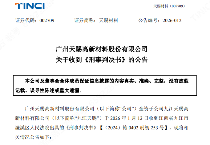 【橡胶助剂产业网】1月15日消息,广州天赐材料(002709.SZ)于近日发布公告,披露其全资子公司九江天赐高新材料有限公司涉及的一起侵犯商业秘密案已获一审判决。江西省九江市濂溪区人民法院的刑事判决书显示,被告浙江研一新能源科技有限公司及其相关责任人被认定构成侵犯商业秘密罪。