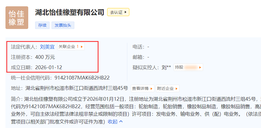 据橡胶助剂产业网了解,项目投资方湖北怡佳橡塑有限公司成立于2026年1月12日,注册地址位于湖北省荆州市松滋市,法定代表人为刘美宜,注册资本为400万元人民币。公司股权结构显示,邱启平与刘美宜各出资200万元,分别持有50%的股份。
