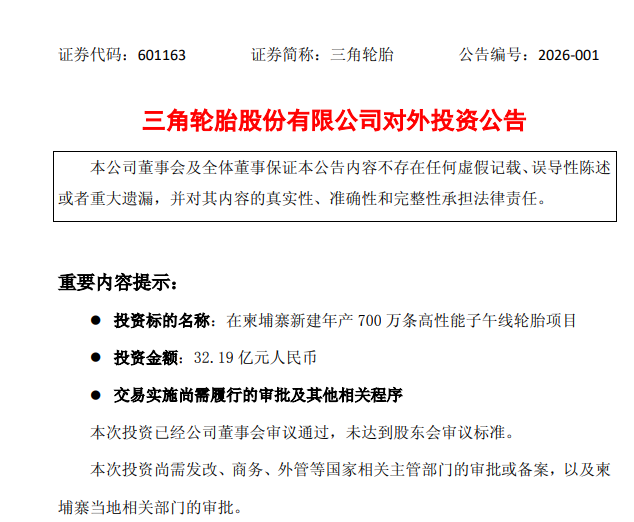 【橡胶助剂产业网】1月16日消息,三角轮胎股份有限公司日前发布对外投资公告,宣布计划在柬埔寨投资建设新的生产基地。该项目总投资额预计为32.19亿元人民币,将形成年产700万条高性能子午线轮胎的生产能力,旨在深化公司的全球化生产与市场布局。