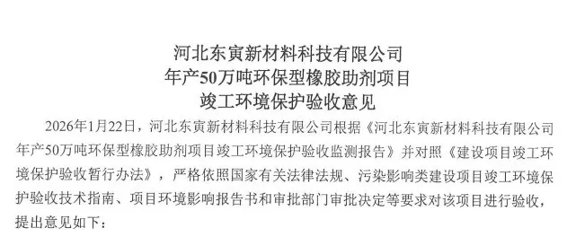 河北东寅新材料科技有限公司年产50万吨环保型橡胶助剂项目竣工环境保护验收报告公示中。