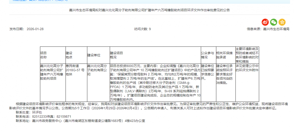 【橡胶助剂产业网】1月29日消息,嘉兴市生态环境局1月28日对嘉兴北化高分子助剂有限公司扩建年产六万吨橡胶助剂项目环评文件做出审批意见的公示,标志着该公司基于整体搬迁升级计划的关键子项目,在合规性审批环节取得重要进展。此次公示的扩建项目,是该公司早前已获批准的“年产10万吨橡胶助剂迁扩建项目”的组成部分及战略调整。根据公示内容,公司对原迁扩建项目中的产品方案进行了优化调整:“保留其预分散母胶料2万吨/年、均匀剂2万吨/年的规模, 取消增塑剂2万吨/年的生产线”。在此基础上,扩建年产 6万吨橡胶助剂的生产线,其中耐迁大分子防老剂(GMA-g-PPDA)1万吨/年、多功能防老剂及其衍生产品1万吨/年、新型偶联剂2万吨/年、Si-69系列硅烷偶联剂2万吨/年。扩建项目建设完成后,企业总的规模控制在年产10万吨橡胶助剂内。购置大分子防老剂反应装置,吸附及造粒装置,偶联剂搅拌混合生产线、脱色釜等设备。