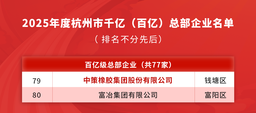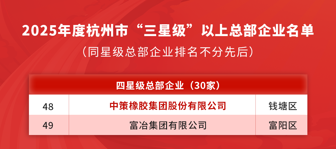 【橡胶助剂产业网】2月3日消息,杭州市近日正式公布了2025年度星级总部企业的评定结果。国内轮胎制造行业的领军企业中策橡胶集团再度凭借其卓越的综合实力,成功蝉联“杭州市四星级总部企业”称号,并同时入选“杭州市百亿级总部企业”名单,其在区域经济发展中的支柱地位与核心贡献获得官方权威认可。