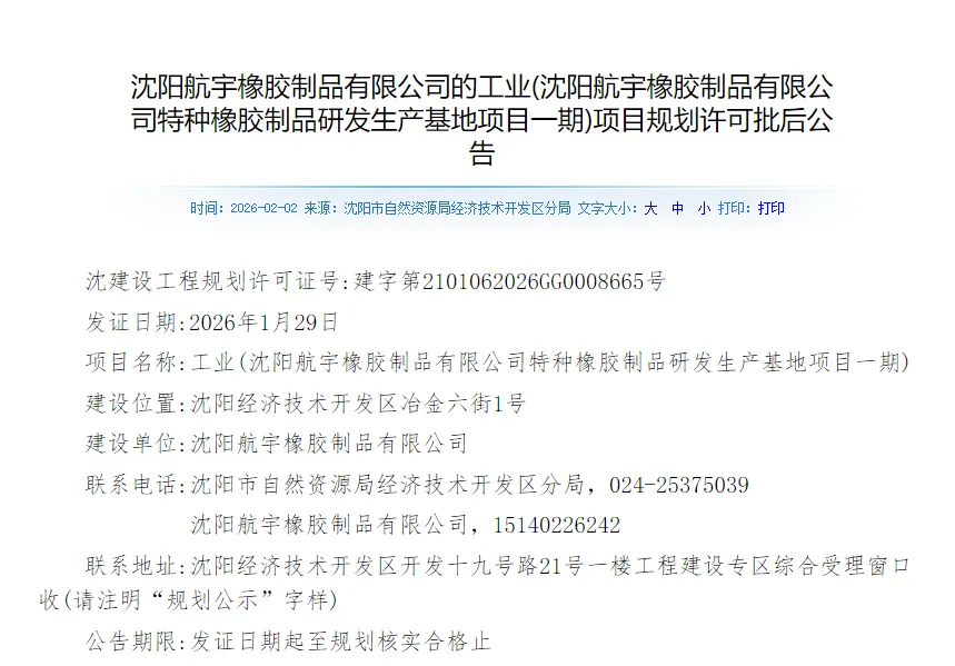 【橡胶助剂产业网】2月5日消息,沈阳航宇橡胶制品有限公司在特种橡胶制品领域的产能扩建计划取得关键性进展。其“工业(特种橡胶制品研发生产基地项目一期)”1月29日正式获得建设工程规划许可证,标志着该项目即将进入实质性建设阶段。根据该项目的规划信息,此研发生产基地为新建项目,选址位于辽宁省沈阳市经济技术开发区冶金六街1号。项目总占地面积约4.28万平方米,规划总建筑面积约为3.15万平方米。据橡胶助剂产业网了解,该项目总投资额预计为2亿元人民币,其设计生产纲领聚焦于高技术含量的特种橡胶管制品,建设1#生产车间、2#生产车间、3#生产车间、办公楼、胶浆间、机油贮存库、己烷贮存库、开姆洛克贮存库、硫磺贮存库、传达室等。项目建成后,总体产能规模预计年产1.5万吨,其中年产疏浚橡胶软管14780t/a、海洋输油胶管50t/a、大长度双轮铣胶管150t/a、特种橡胶制品20t/a。该项目建成后,将显著提升沈阳航宇在疏浚、海洋工程及特种装备配套用高端橡胶管带领域的研发与制造能力。作为一次重要的产能扩张与升级,该基地有望进一步巩固企业在特种橡胶制品市场的地位,并为相关下游产业提供关键配套支持,对区域高端装备制造业的发展起到积极的推动作用。