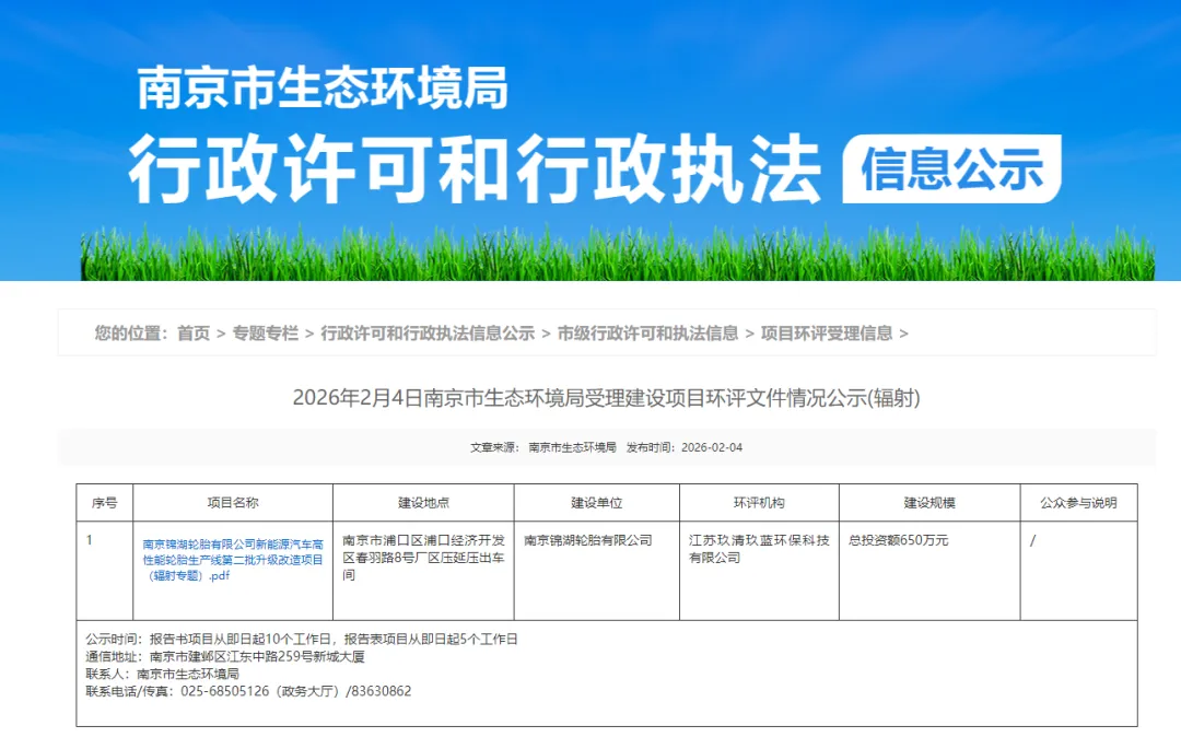 2月4日,南京锦湖轮胎有限公司“新能源汽车高性能轮胎生产线第二批升级改造项目(辐射专题)”发布环评公示,具体地点位于江苏省南京市浦口经济开发区。公示信息显示,该项目计划总投资为650万元人民币,其中专门用于环境保护的投资达到200万元,约占总投资的30.8%。核心内容是由于生产检测需要,拟在厂区压延压出车间新建1台EB500 型电子加速器辐照装置。据橡胶助剂产业网了解,该套先进的辐照设备将主要用于对轮胎制造中的关键骨架材料——纤维帘布进行辐照预处理。通过这一物理改性工艺,能够有效改善帘布的表面性能,从而增强其与橡胶基体的粘合强度,满足公司生产高端新能源汽车轮胎对原材料提出的更高要求。此举预计将对企业提升生产效率和最终产品品质产生积极影响。公开资料显示,南京锦湖轮胎有限公司已依法取得辐射安全许可证,该证有效期至2030年5月21日。此次环评公示的进行,标志着该项聚焦于材料改性环节的技术升级项目正按计划稳步推进,旨在通过引入绿色高效的预处理技术,强化其在新能源汽车轮胎市场的竞争力。