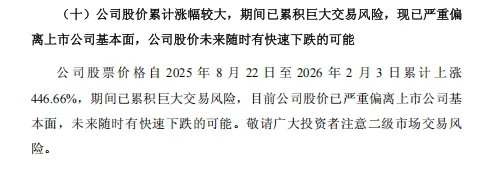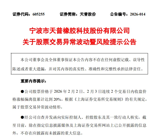 2月4日,宁波市天普橡胶科技股份有限公司发布关于股票交易异常波动暨风险提示公告,披露其股价近期剧烈震荡,并集中回应了多项市场传闻与监管关注。根据公告,天普股份股票于2026年2月2日至3日连续两个交易日累计涨幅偏离值超过20%,构成异常波动。值得注意的是,自2025年8月22日至2026年2月3日,公司股价累计涨幅高达446.66%,期间多次触及异常波动甚至严重异常波动,公司已累计发布28次相关风险提示。与此形成反差的是,公司2025年前三季度营业收入与净利润同比均有所下滑,基本面并未发生重大变化,主营业务仍集中于传统燃油车用高分子流体管路及密封系统。公告中,公司用较大篇幅澄清了多项市场传闻,尤其是与股东中昊芯英(杭州)科技有限公司相关的人工智能合作、资产注入及资本运作等猜测。公司明确表示,自身及子公司天普欣才均无人工智能技术储备与业务计划,未与中昊芯英签订任何合作协议;中昊芯英亦无资产注入或借壳上市安排,其资本证券化路径独立于上市公司。除市场炒作外,天普股份近期还面临一系列监管与合规压力:公司因涉嫌信息披露违规被中国证监会立案调查,并已收到上海证券交易所的监管警示决定书;同时,因税收政策理解偏差,公司补缴企业所得税及滞纳金共计581.19万元,预计将直接影响2026年净利润。2025 年前三季度,天普股份营业收入同比下降 4.98%,归属于上市公司股东的净利润同比下降 2.91%,业绩呈现下滑态势。截至2026年2月3日,天普股份市盈率高达600.21倍,市净率达24.20倍,显著高于汽车零部件行业平均水平(市盈率约32倍,市净率约3.5倍)。此外,公司控股股东及其一致行动人合计持股比例达68.29%,外部流通盘相对较小,存在非理性炒作风险。