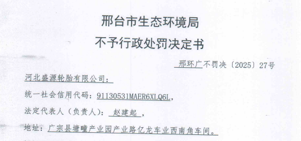 【橡胶助剂产业网】2月7日消息,河北省邢台市生态环境局近日针对一起轮胎制造企业的环境违法案件,出具了《不予行政处罚决定书》。涉案企业河北盛源轮胎有限公司,因在建设过程中存在“未批先建”的违法行为被调查,最终因情节轻微且及时纠正,被依法免予行政处罚。