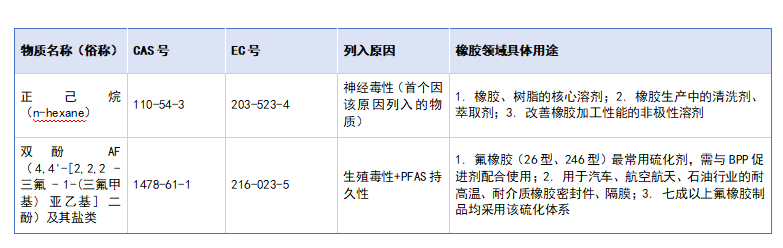 据橡胶助剂产业网了解,仅仅两天后的2月4日,ECHA再次更新了高度关注物质候选清单,新增了正己烷以及双酚AF(即4,4’-[2,2,2-三氟-1-(三氟甲基)亚乙基]二酚)及其盐类。此次更新使得SVHC候选清单上的物质总数增加至253项。双酚AF作为高性能氟橡胶的关键硫化剂,其被列入清单将对特种橡胶产业产生直接影响。