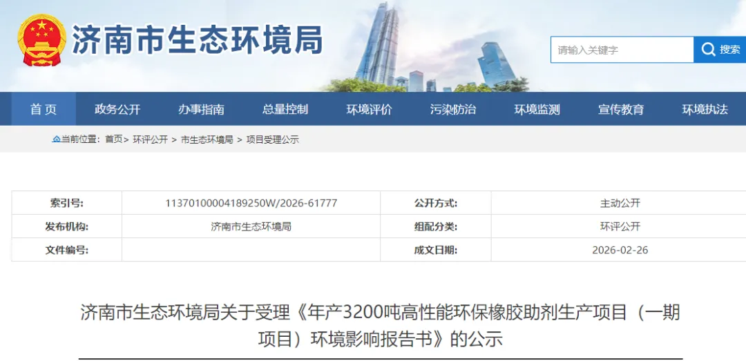 【橡胶助剂产业网】3月3日消息,2月26日,济南市生态环境局发布关于受理济南正兴橡胶助剂有限公司“年产3200吨高性能环保橡胶助剂生产项目”,一期工程的环评公示。