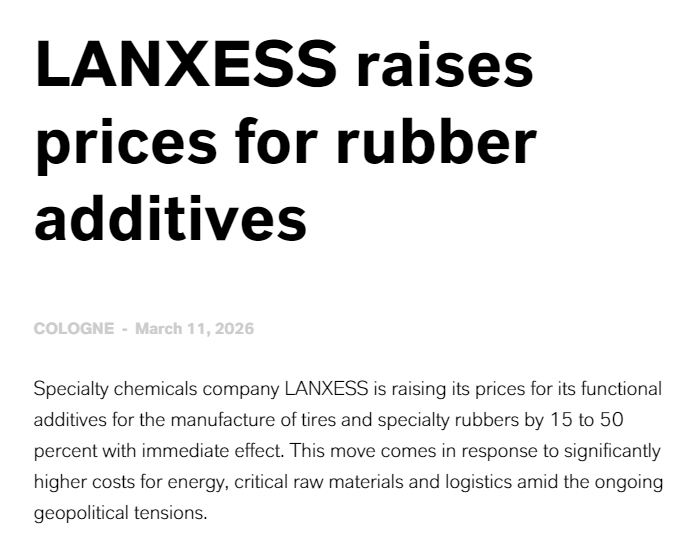 3月11日,朗盛(LANXESS)发布涨价函,宣布即刻起对轮胎及特种橡胶生产用功能性助剂价格上调15%-50%,调价原因是为应对当前地缘政治紧张局势下,能源、关键原材料及物流成本大幅上涨。这一动作加剧了行业成本压力,也印证了当前橡胶助剂市场的成本驱动格局。