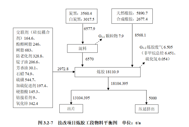 本次项目生产工艺为炼胶-出片/压延覆胶-压延、押出/裁断--成型(本次技改)-内面离型剂喷涂-硫化(本次技改)-激光清洗-自密封-打标-海绵贴付(本次技改)-检验(本次技改)-成品。