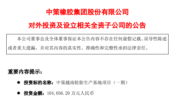 【橡胶助剂产业网】4月3日消息,中策橡胶集团股份有限公司1日晚间发布公告,计划投资约10.41亿元,在越南胡志明市建设“中策越南轮胎生产基地项目(一期)”。该项目旨在进一步优化公司的海外产能布局,构建更加灵活多元的全球供应体系,以应对复杂的国际贸易环境。项目资金将全部由企业自有资金解决。
